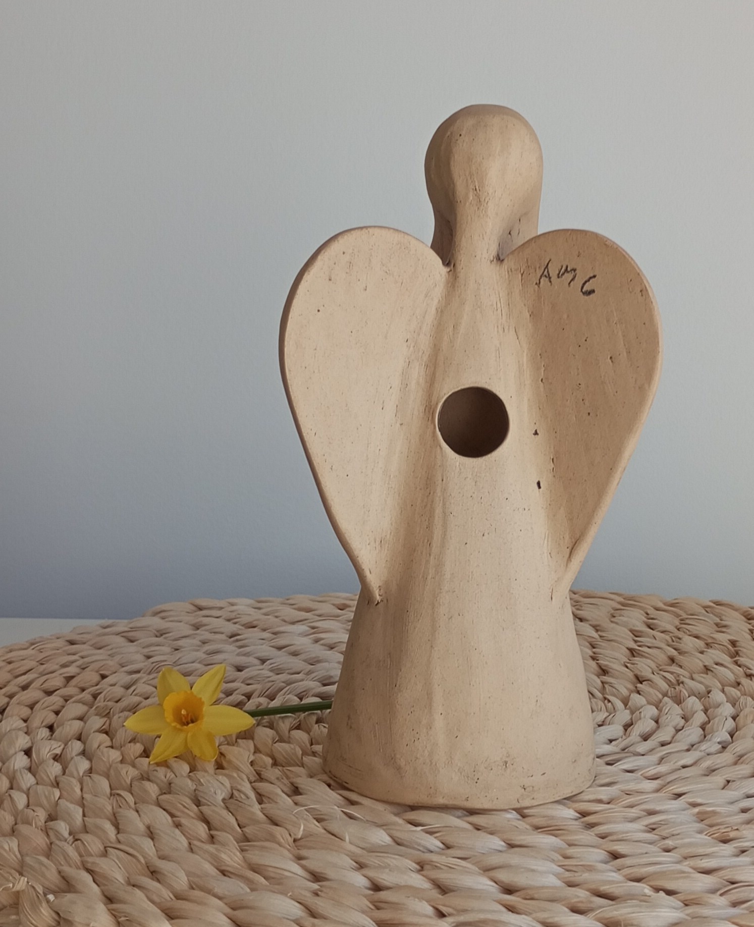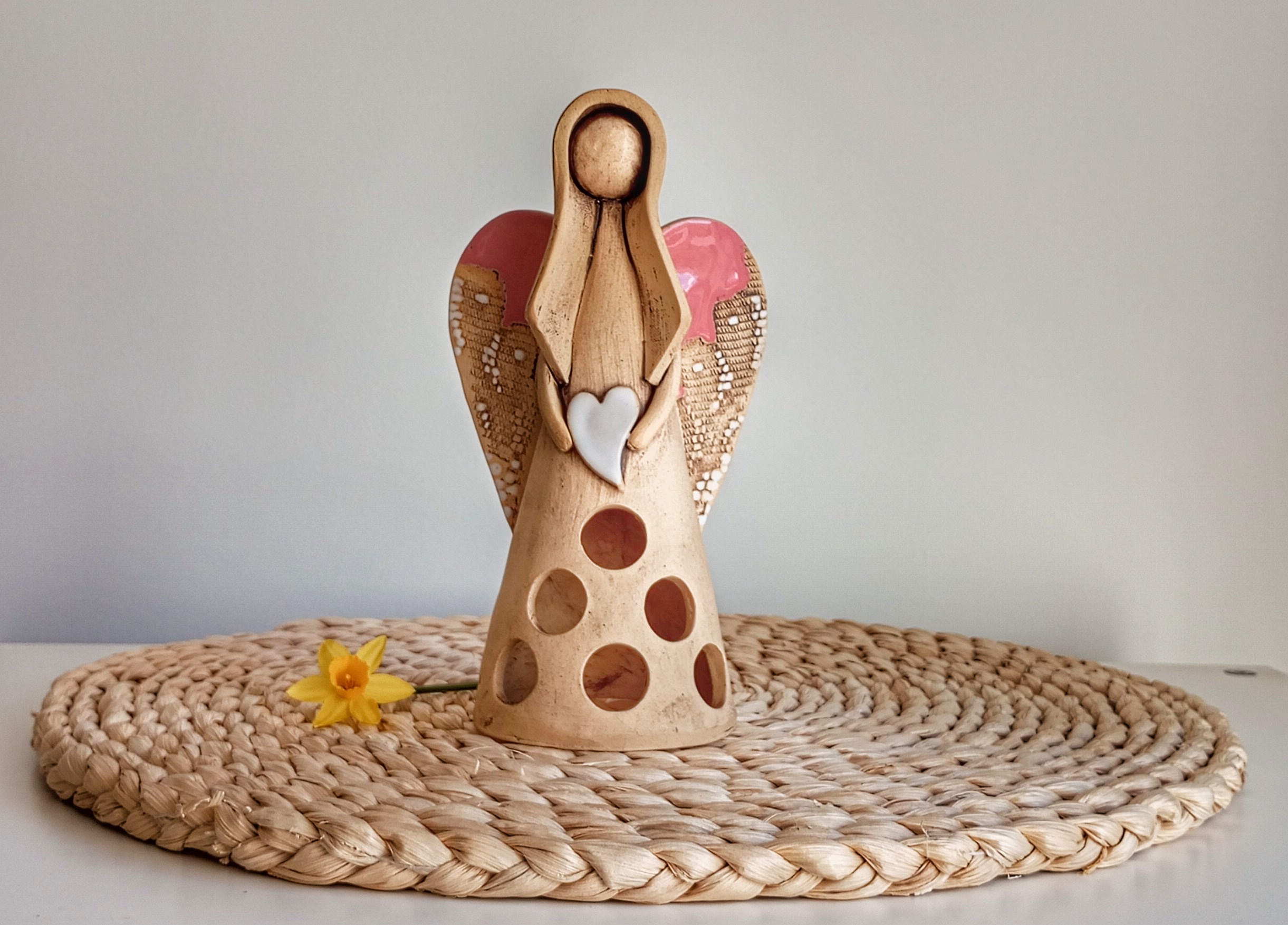 Keramický anděl je ručně modelovaný a malovaný.