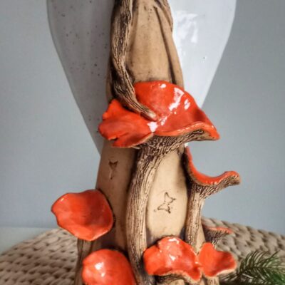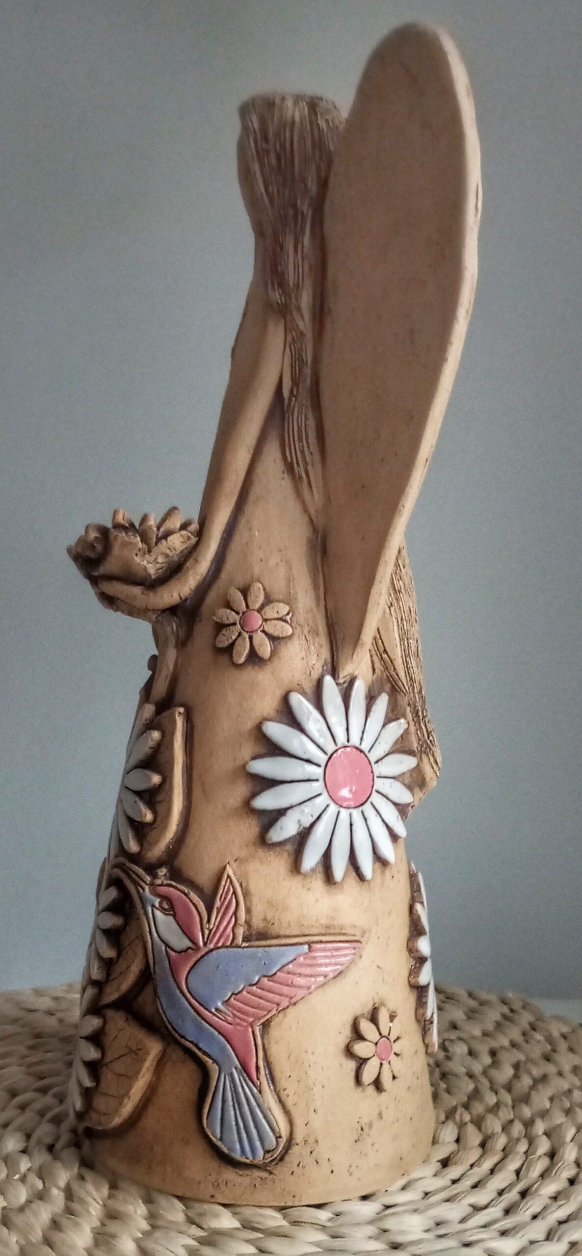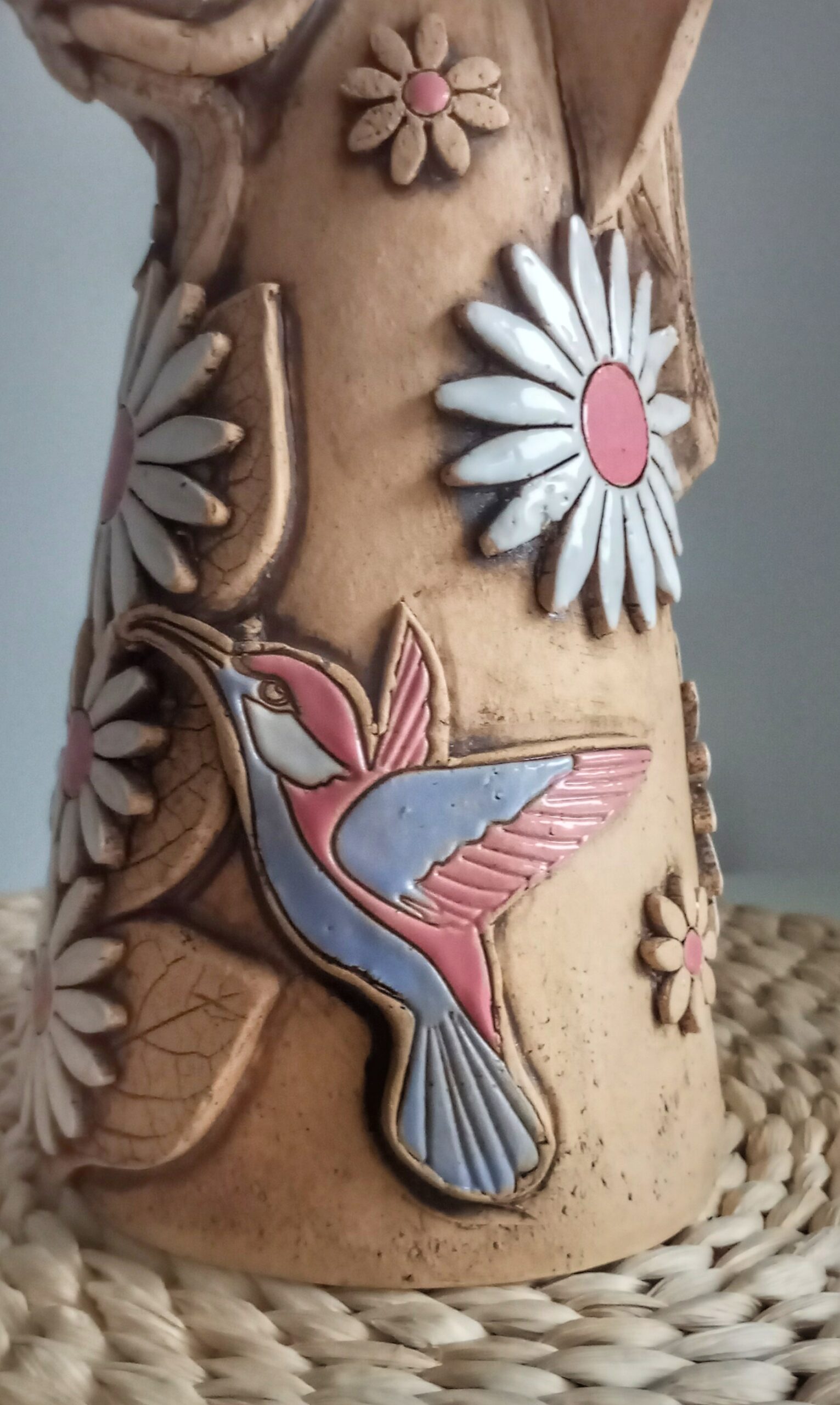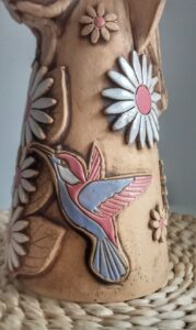 Ručně modelovaná a malovaná, zdobená květinami a kolibříkem.