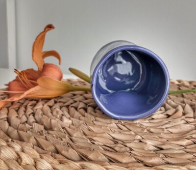 Ručně modelovaný hrníček bez ouška, který je uprostřed promáčknutý na palec – skvěle se drží.